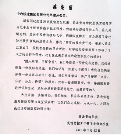 中啟膠建集團(tuán)華東分公司副經(jīng)理、青島中筑置業(yè)有限公司經(jīng)理李世杰代表公司進(jìn)行捐贈,并表示,中啟膠建集團(tuán)時(shí)刻以踐行社會責(zé)任為己任,大疫當(dāng)前,我公司愿盡綿薄之力與黃海學(xué)院共同擔(dān)當(dāng),共克時(shí)艱。隔山隔水不隔愛,封城封路不封心,讓我們眾志成城、守望相助,形成合力共同打贏這場疫情防控阻擊戰(zhàn)!