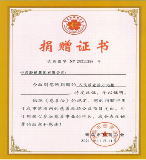 近年來(lái),集團(tuán)在發(fā)展壯大的同時(shí),始終不忘回報(bào)社會(huì),主動(dòng)承擔(dān)社會(huì)責(zé)任,2012年起在膠州市慈善總會(huì)設(shè)立中啟膠建慈善基金,用于經(jīng)濟(jì)薄弱村村容村貌改造和弱勢(shì)群體救助,多年來(lái)累計(jì)捐贈(zèng)達(dá)1200余萬(wàn)元。集團(tuán)將一直秉承著中華民族的傳統(tǒng)美德, 積極參與慈善公益事業(yè),踐行社會(huì)責(zé)任,用慈心善舉共筑愛(ài)的大家庭,為我市慈善事業(yè)的發(fā)展作出積極貢獻(xiàn)。