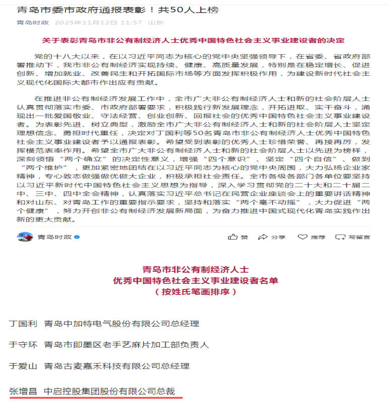 11月12日,青島時(shí)政新聞網(wǎng)公布了青島市委市政府《關(guān)于表彰青島市非公有制經(jīng)濟(jì)人士優(yōu)秀中國特色社會(huì)主義事業(yè)建設(shè)者的決定》,集團(tuán)黨委書記、總裁張?jiān)霾?0人光榮上榜。