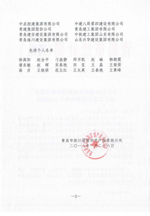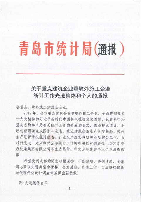 2017年公司全面貫徹落實(shí)十九大精神和習(xí)近平新時(shí)代中國特色社會主義思想,認(rèn)真執(zhí)行和落實(shí)山東省統(tǒng)計(jì)局和青島市統(tǒng)計(jì)局有關(guān)統(tǒng)計(jì)工作的部署和要求,依法規(guī)范統(tǒng)計(jì)、不斷創(chuàng)新,圓滿完成國家一套表、重點(diǎn)建筑企業(yè)生產(chǎn)月度報(bào)表、境外生產(chǎn)經(jīng)營情況統(tǒng)計(jì)報(bào)表、行業(yè)生產(chǎn)經(jīng)營調(diào)研等各項(xiàng)統(tǒng)計(jì)工作。榮獲青島市重點(diǎn)建筑業(yè)暨境外施工企業(yè)“統(tǒng)計(jì)工作先進(jìn)集體”稱號。