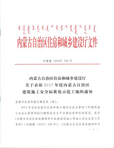近日,由中啟膠建集團有限公司建筑二分公司承建的霍林郭勒市沙爾呼熱獨立工礦區(qū)中蒙醫(yī)院(二期)建設項目和內(nèi)蒙古蒙東科技城建設項目榮獲2017年度內(nèi)蒙古自治區(qū)建筑施工“安全標準化示范工地”獎項。