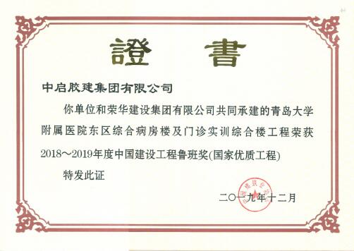 12月10日,由中國建筑業(yè)協(xié)會組織的“建筑業(yè)科技創(chuàng)新暨2018~2019年度中國建設(shè)工程魯班獎(國家優(yōu)質(zhì)工程)表彰大會”在北京隆重召開。建筑七公司承建的“青島大學(xué)附屬醫(yī)院東區(qū)綜合病房樓及門診實訓(xùn)綜合樓工程”喜獲國家質(zhì)量最高獎項 “魯班獎”。