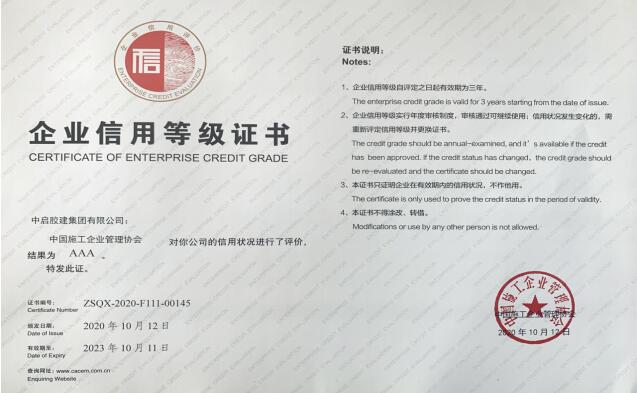 近日,中國施工企業(yè)管理協(xié)會發(fā)布了《關(guān)于公布2020年度第一批工程建設(shè)企業(yè)信用評價(jià)結(jié)果的通知》,中啟膠建集團(tuán)通過2020年度第一批工程建設(shè)信用評價(jià)AAA級企業(yè)復(fù)評。