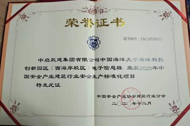 此外,中啟膠建集團(tuán)建筑七公司中國海洋大學(xué)西海岸校區(qū)電子信息樓項(xiàng)目榮獲“2020年中國安全產(chǎn)業(yè)建筑行業(yè)安全生產(chǎn)標(biāo)準(zhǔn)化項(xiàng)目”稱號。