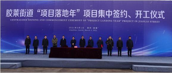 2021年3月1日上午,膠萊街道“項目落地年”項目集中簽約開工儀式在中啟產業(yè)園隆重舉行。市委副書記、市長畢維準,市政協(xié)黨組副書記、副主席趙遵路,市政協(xié)副主席徐啟斌以及膠州市有關部門單位領導,膠萊街道辦事處有關領導,32家簽約及開工企業(yè)代表蒞臨參加,中啟控股集團董事局主席張啟榮、總裁郭道盛等集團有關領導出席儀式。