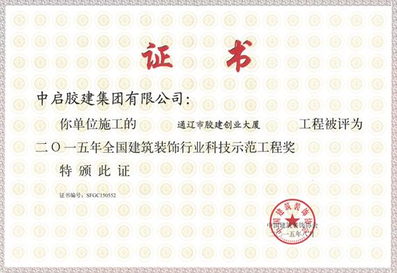 建筑六公司施工的通遼市膠建創(chuàng)業(yè)大廈裝飾工程,榮獲2015年全國建筑裝飾行業(yè)科技示范工程獎,這是我公司首次榮獲此殊榮。