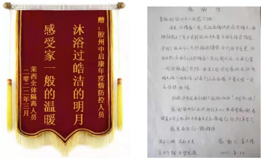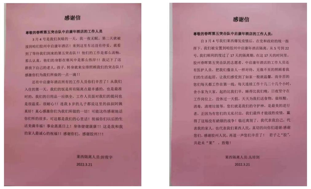 在這場持續(xù)性的抗疫行動中,中啟康年酒店始終堅守防疫第一線,積極肩負(fù)起為給隔離人員提供優(yōu)質(zhì)精細(xì)化服務(wù)的社會責(zé)任,收到了來自隔離人員及防疫突擊隊的一致好評,一封封真摯懇切的感謝信接踵而來。打贏這場“戰(zhàn)役”需要我們酒店上下一心,以實際行動配合各部門行動,認(rèn)真遵循集團(tuán)公司和防疫指揮部的要求,努力完成各項經(jīng)營指標(biāo)以及防疫抗疫工作,爭做酒店行業(yè)模范標(biāo)兵。