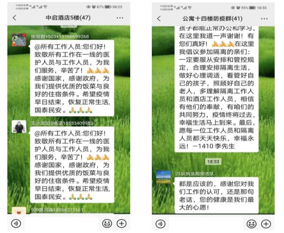 閉環(huán)管理中,人員是處于封閉狀態(tài)的,與普通隔離工作相比,存在的問題多,工作難度也更大。為了更好的服務(wù)每一位工作人員,酒店主動建立微信群,了解工作人員的需求,群內(nèi)24小時都有人回復(fù),真正做到了有需求隨叫隨到。我們的工作性質(zhì)較為特殊,24小時倒班制成為了常態(tài)化,這樣也就決定了后勤保障也必須24小時跟進。
