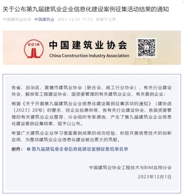 12月1日,中國建筑業(yè)協(xié)會(huì)公布了第九屆建筑業(yè)企業(yè)信息化建設(shè)案例征集活動(dòng)結(jié)果,中啟膠建集團(tuán)承建的一汽解放青島基地研發(fā)能力提升項(xiàng)目榮獲“一類成果”佳績。