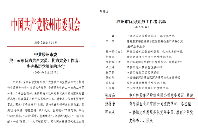 近日,市各級(jí)黨委為表彰先進(jìn)、弘揚(yáng)正氣,激勵(lì)廣大黨員和各級(jí)黨組織牢記囑托、勇?lián)姑?,在慶祝中國(guó)共產(chǎn)黨成立103周年之際,通報(bào)表?yè)P(yáng)了一批優(yōu)秀個(gè)人和先進(jìn)集體,集團(tuán)黨委喜獲多項(xiàng)殊榮。集團(tuán)黨委書記、總裁張?jiān)霾緲s獲青島市非公經(jīng)濟(jì)組織“黨員先鋒崗”和膠州市優(yōu)秀黨務(wù)工作者稱號(hào);中啟膠建集團(tuán)裝飾公司賈維敏同志榮獲膠州市委“兩新”工委優(yōu)秀共產(chǎn)黨員稱號(hào);中啟控股集團(tuán)黨委榮獲膠州市委“兩新”工委先進(jìn)基層黨組織稱號(hào);集團(tuán)黨委所屬的中啟控股集團(tuán)機(jī)關(guān)黨支部、中啟膠建集團(tuán)膠州公司黨支部和中啟膠建集團(tuán)青島公司黨支部獲評(píng)“2023年度膠州市五星級(jí)黨組織”稱號(hào)。