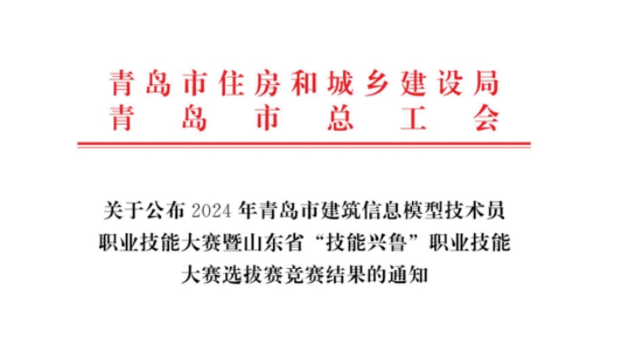7月16日,在青島市住房和城鄉(xiāng)建設局、青島市總工會聯(lián)合主辦的2024年青島市建筑信息模型技術員職業(yè)技能大賽暨山東省“技能興魯”職業(yè)技能大賽選拔賽中,我公司市場經(jīng)營部袁盛同志榮獲個人賽三等獎,青島公司姜培杰、楊經(jīng)光、王煒曉同志組成的參賽小組榮獲團隊賽優(yōu)秀組織獎。