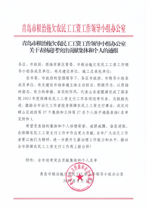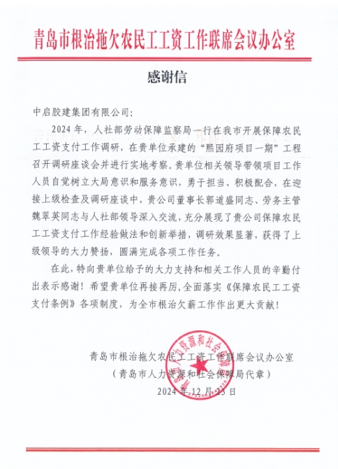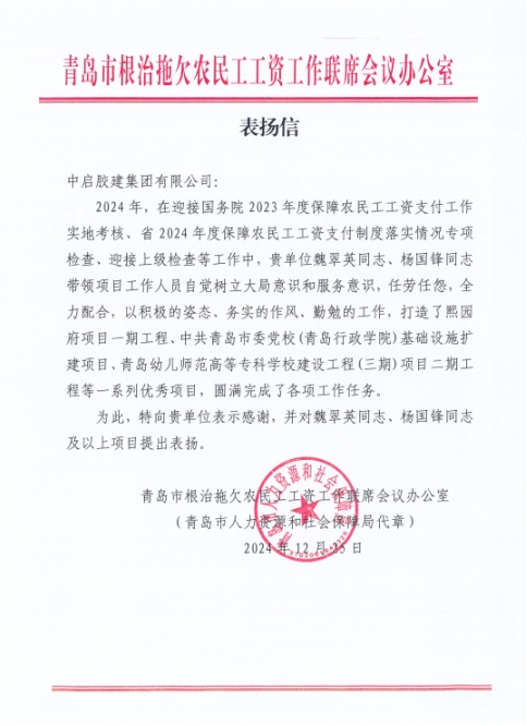 2024年,在公司領(lǐng)導(dǎo)的正確帶領(lǐng)下,在各單位各項(xiàng)目的大力支持和相關(guān)工作人員辛勤付出下,公司在保障農(nóng)民工工資支付工作方面先后圓滿完成了各項(xiàng)調(diào)研、檢查工作并取得了優(yōu)異成績(jī)。為表彰我公司在保障農(nóng)民工工資支付工作方面做出的突出貢獻(xiàn),青島市人社局、膠州市人社局分別向公司發(fā)來(lái)感謝信,對(duì)公司及在調(diào)研、檢查工作中做出突出貢獻(xiàn)的先進(jìn)項(xiàng)目和先進(jìn)個(gè)人魏翠英、楊國(guó)鋒進(jìn)行通報(bào)表?yè)P(yáng)。