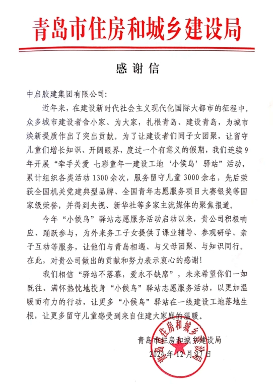 2025年1月8日,青島市住房和城鄉(xiāng)建設(shè)局發(fā)來感謝信,對集團(tuán)公司在“小候鳥”驛站志愿服務(wù)活動開展過程中所付出的努力給予感謝和肯定。