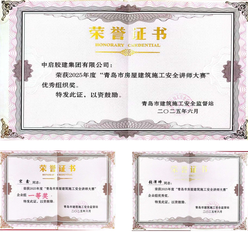 參賽組分為安全管理類、安全技術(shù)類、科技類,涵蓋了建筑施工安全管理、大型設備安全管理、高處作業(yè)、有限空間等類別。經(jīng)過篩選、預選、決賽,共評選出企業(yè)優(yōu)秀組織獎4個,企業(yè)個人一等獎2個、二等獎4個、三等獎6個、優(yōu)秀獎20個。集團選送參賽的兩位員工:華東公司宋鑫獲得企業(yè)組一等獎、膠州公司張澤帥獲得企業(yè)組優(yōu)秀獎。同時中啟膠建集團有限公司獲得“優(yōu)秀組織獎”。
