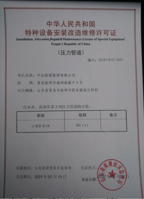 2017年1月12日,中啟膠建集團有限公司通過省質(zhì)監(jiān)局評審,獲得特種設(shè)備安裝改造維修許可證公用管道GB2(2)許可證書,公司將以此為契機,進(jìn)一步拓展公司的業(yè)務(wù)范圍,積極參與城市綜合管廊工程,力爭實現(xiàn)突破。