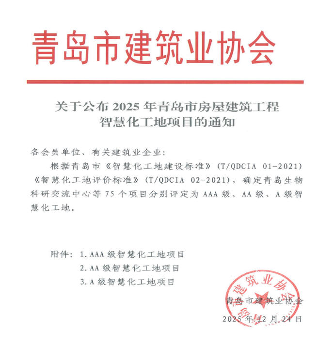 12月24日,青島市建筑業(yè)協(xié)會公布了青島市智慧化工地名單,中啟膠建集團憑借在智慧化施工領(lǐng)域的創(chuàng)新實踐與突出成效,連續(xù)斬獲多項榮譽,包括“房屋建筑工程AAA智慧化工地”、“房屋建筑工程AA智慧化工地”、“房屋建筑工程A智慧化工地”稱號。這一系列榮譽的獲得不僅彰顯了中啟膠建集團在建筑施工智慧化轉(zhuǎn)型中的領(lǐng)先地位,也為青島建筑業(yè)高質(zhì)量發(fā)展提供了創(chuàng)新樣板。